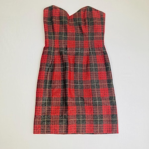 Anne Klein vintage 90s plaid wool strapless mini dress with metallic thread.